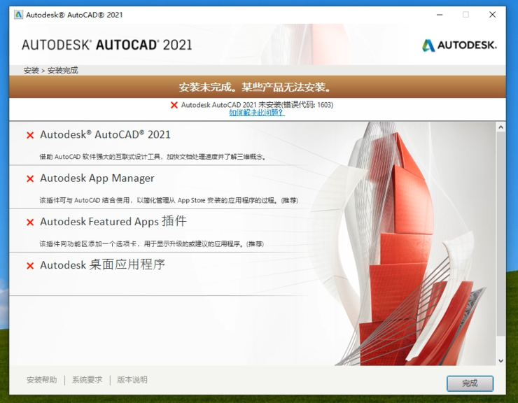 安装Autodesk2020或2021版本的软件时,由于错误代码1603,显示安装不完整,安装Autodesk2021或更低版本时,显示 某些产品无法安装(错误代码1603)
