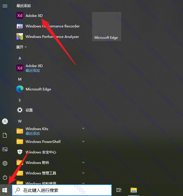 打开系统开始菜单,点击运行Adobe XD