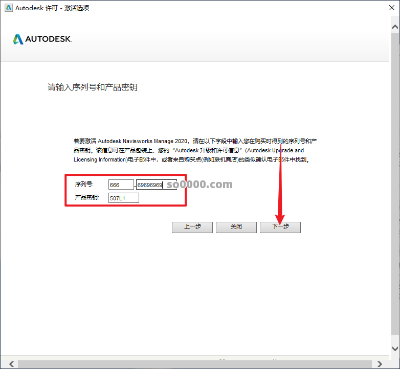 输入序列号666-69696969 密钥:507L1 ,点击下一步