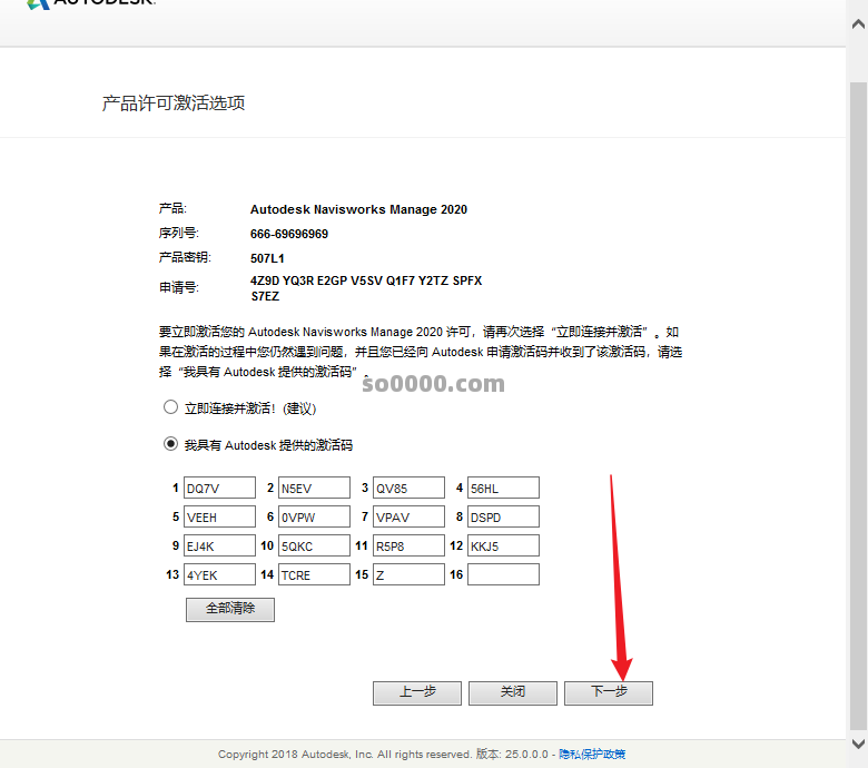 输入序列号666-69696969 密钥:507L1 ,点击下一步